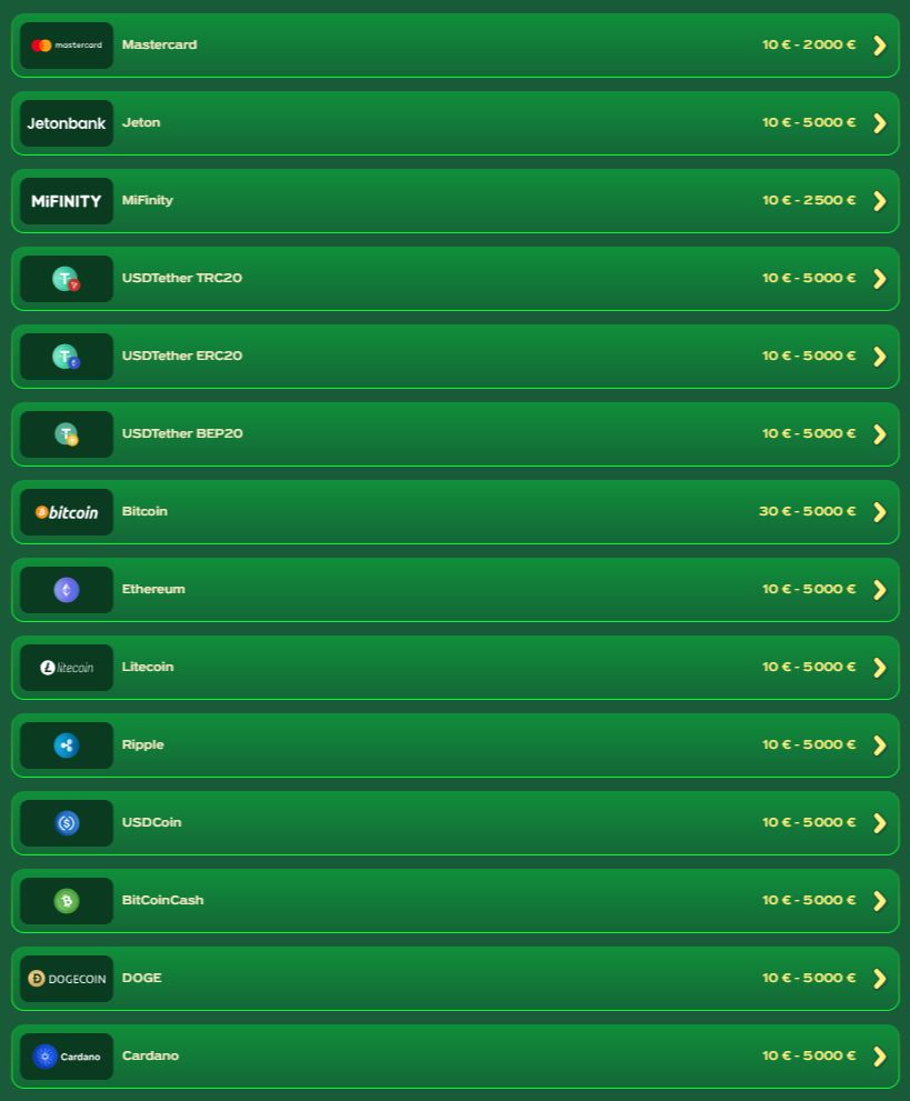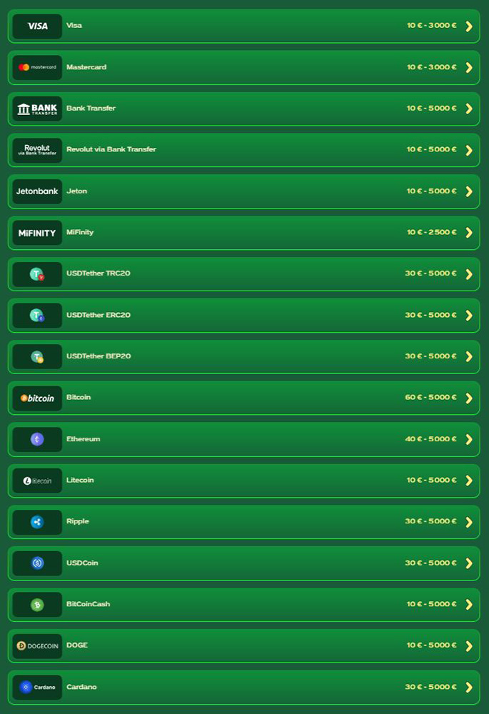 Il est étonnant que la carte bancaire Visa n’ait pas été ajouté aux méthodes de dépôt, mais il peut s’agir d’un oubli de Greenluck Casino. Il conviendrait de contacter le service client pour en avoir confirmation. Outre ce détail, notons que le paiement mobile n’est certes pas disponible, mais que de nombreuses méthodes sont acceptées : carte bancaire ou prépayée, virement, portefeuille électronique ou crypto (et de nombreux jetons sont acceptés).