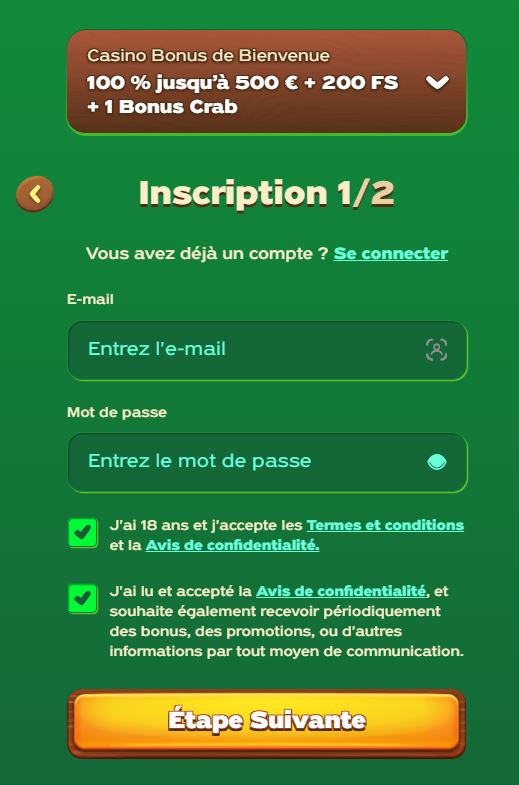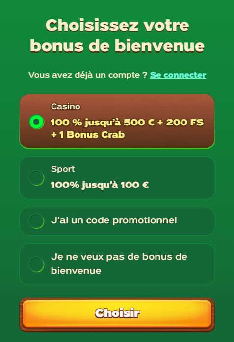- le premier, adressé aux joueurs de casino, de 100% jusqu’à 500€ + 200 tours gratuits + 1 Bonus Crab,