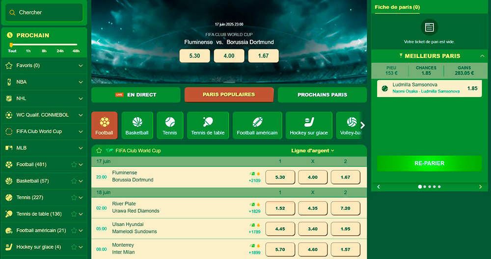 - les paris live, où tous les matchs en direct figurent - et il est possible de parier en direct;